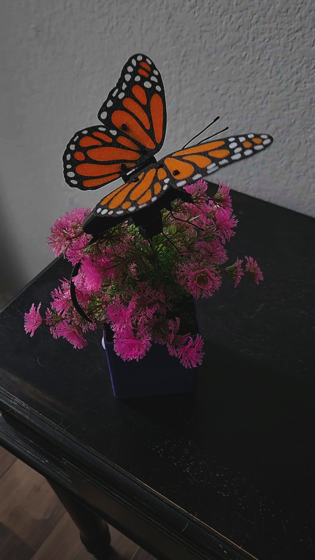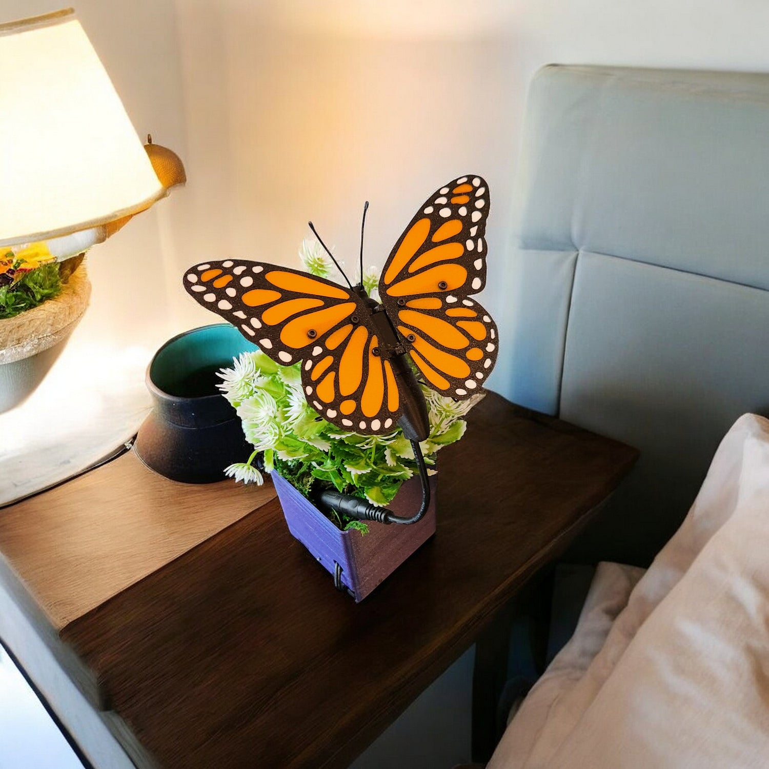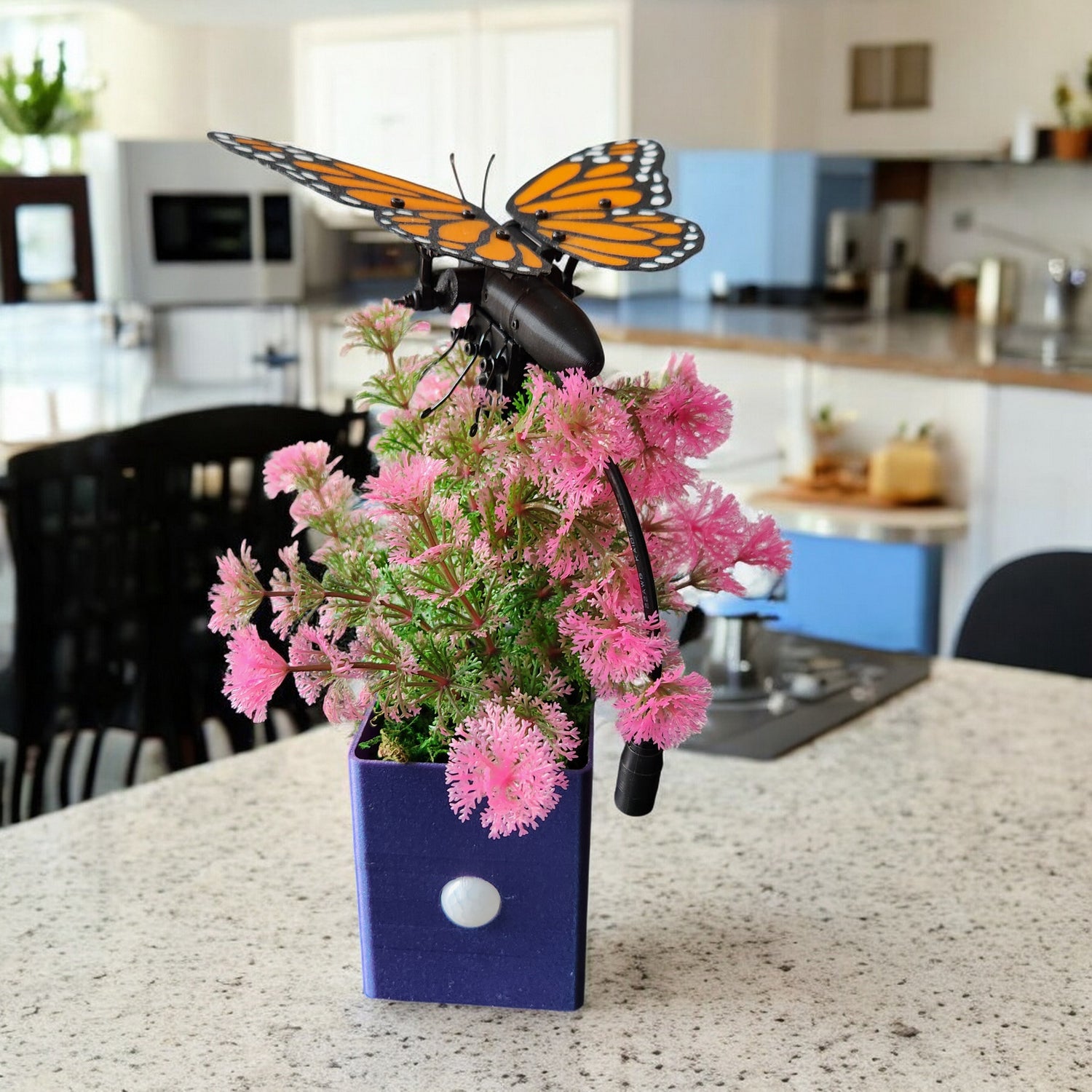 This small, colorful butterfly rests delicately on top of a lifelike flower pot, adding a touch of nature to any desktop. With its battery-operated, motion-sensing technology, this butterfly will bring joy and charm to your workspace. Perfect for adding a whimsical and natural element to your decor.