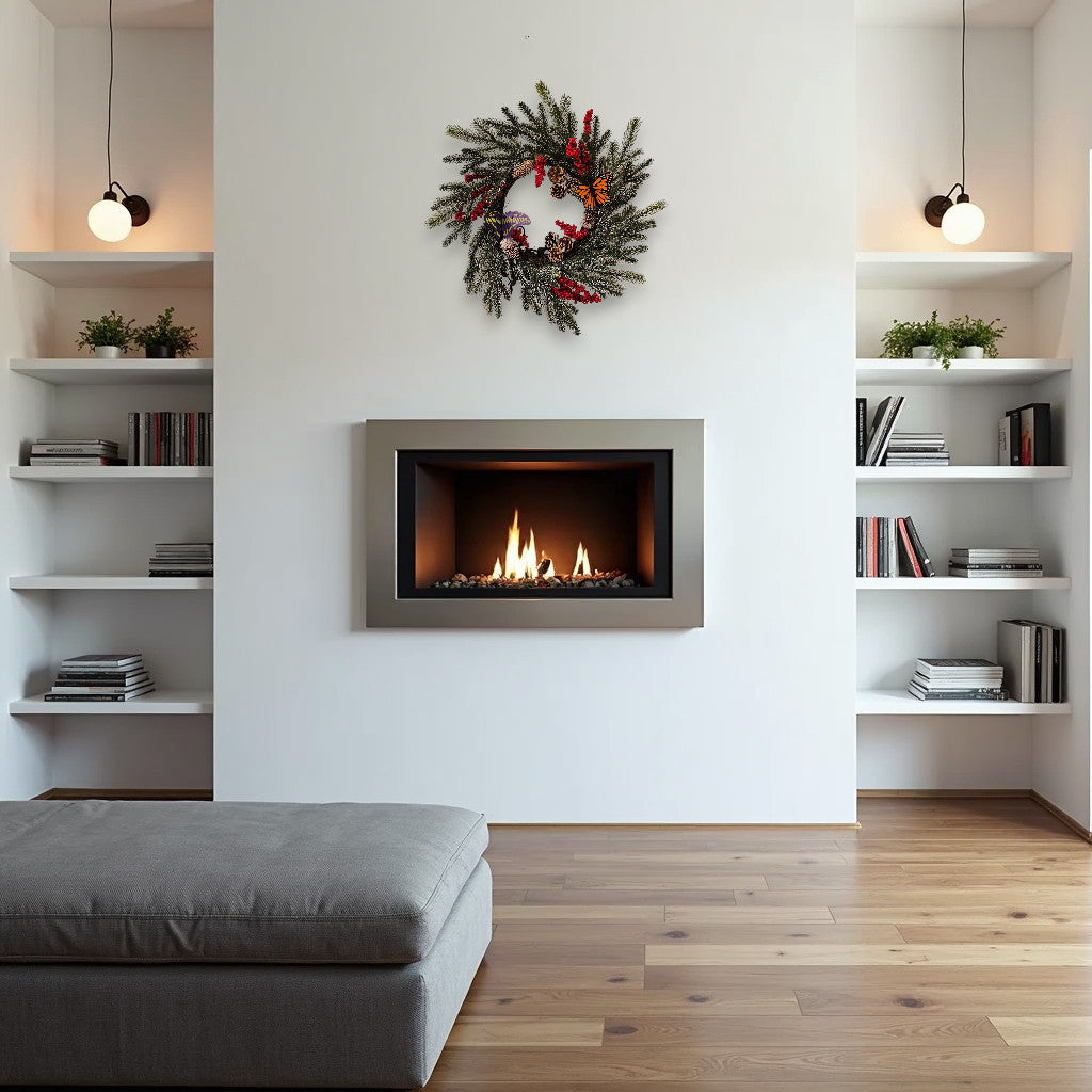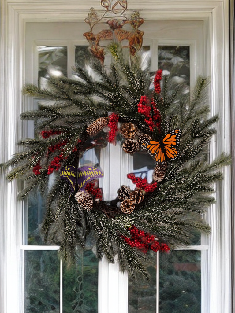 Add a touch of whimsy to your front door or add a touch of elegance to any indoor space with our Wreath Butterfly. Use it as a versatile decoration to elevate your home decor. Perfect for any season or occasion. This beautifully crafted wreath features two small, colorful mechanical butterflies that use batteries and have motion sensing capabilities. The butterfly will flutter if someone approaches the wreath. These fun additions are sure to delight anyone.